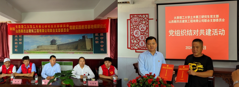 在活动仪式上,土木第三研究生党支部书记何斌与山西朝杰古建筑工程有限公司联合党支部书记王照共同签署了党组织结对共建协议;支部书记何斌和副书记马富丽及公司联合党支部书记和公司总经理王国和共同为党建实践教育基地揭牌。